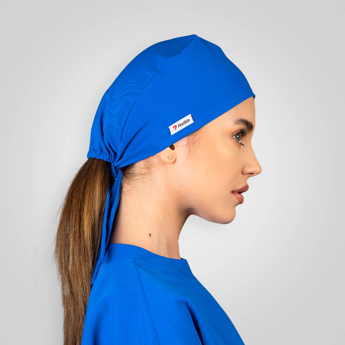 Bonetă medicală albastră de damă ușor de asortat în costumele medicale, ajustabilă, croită cu texturi lejere și funcționale