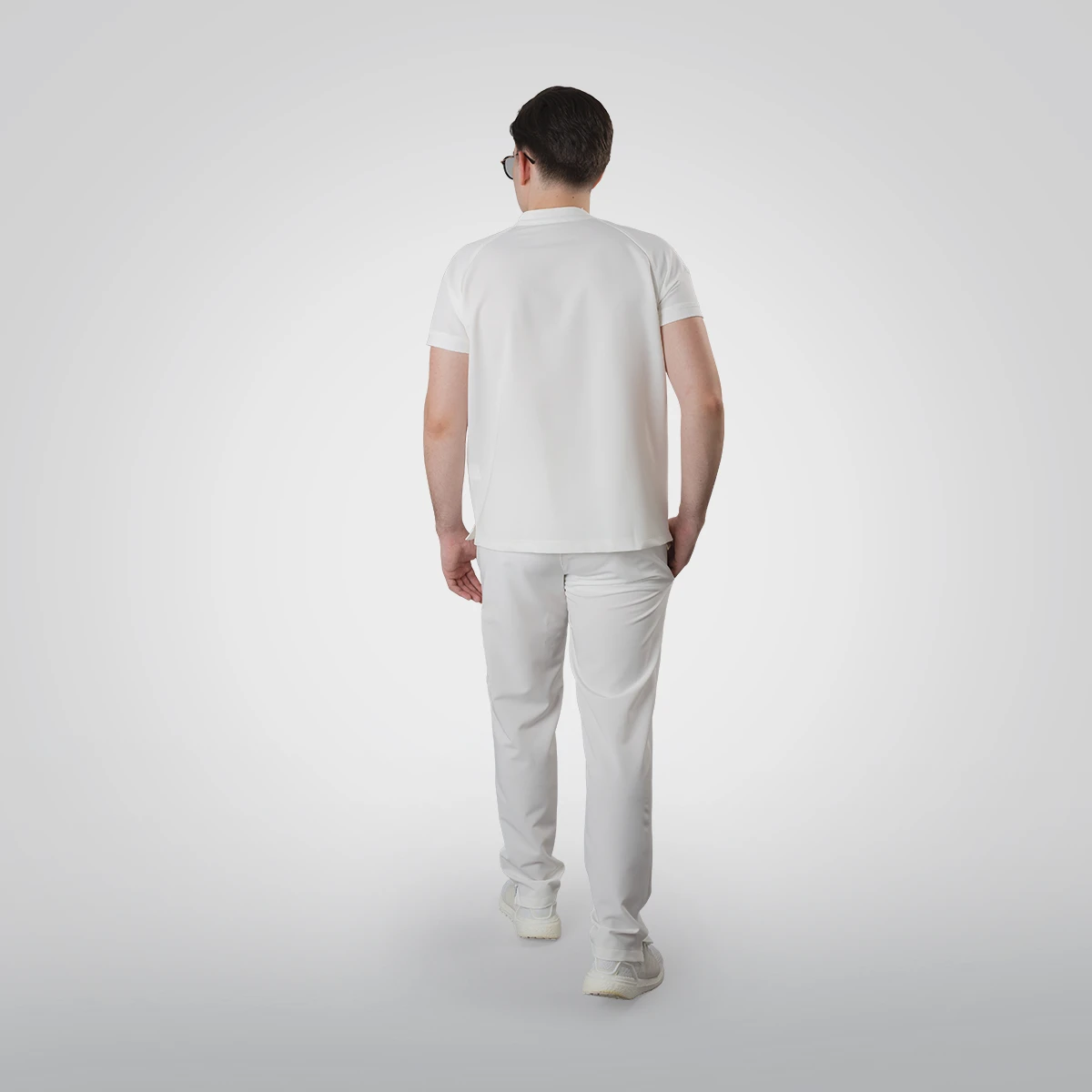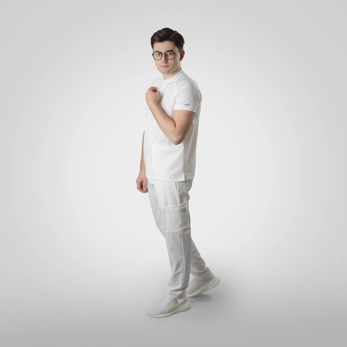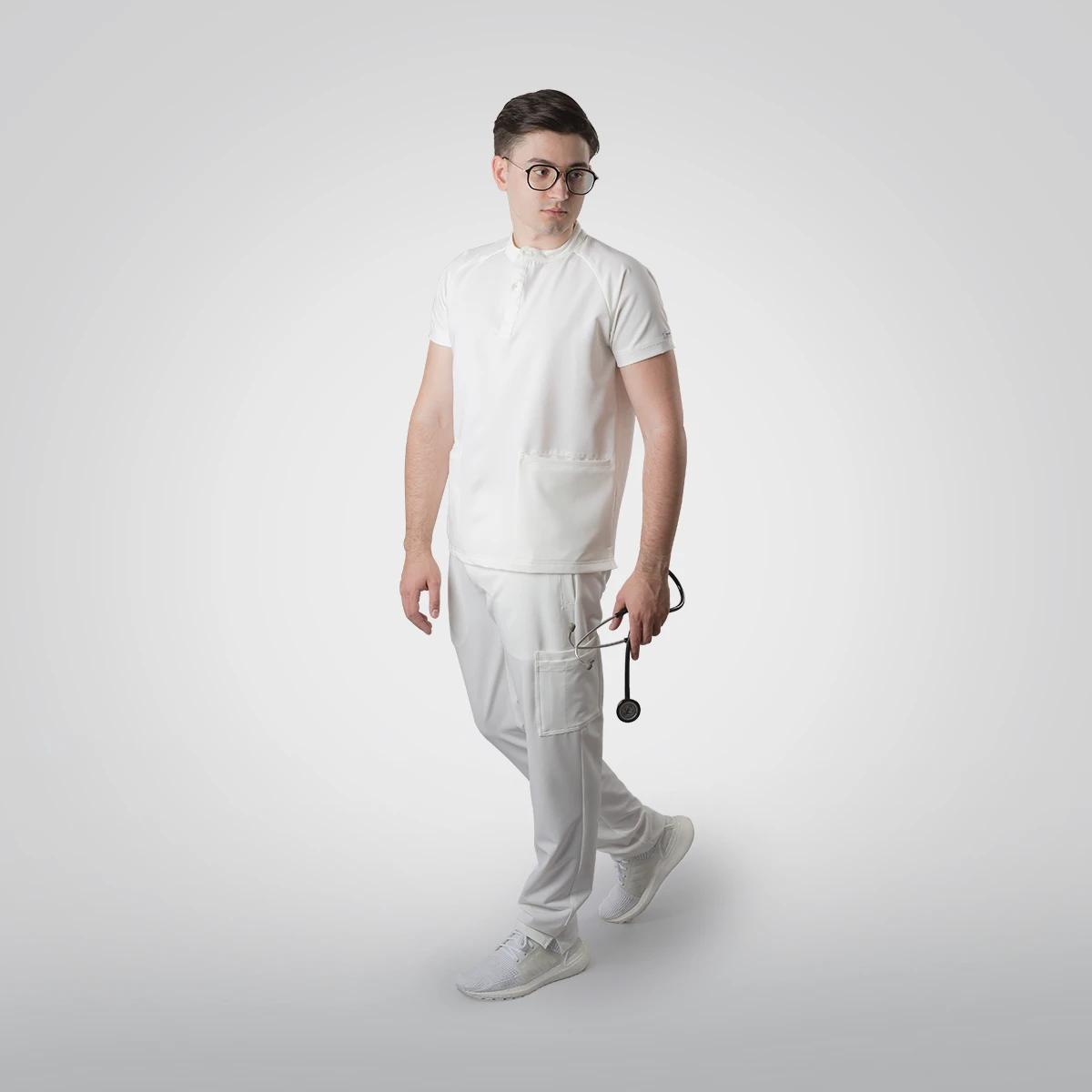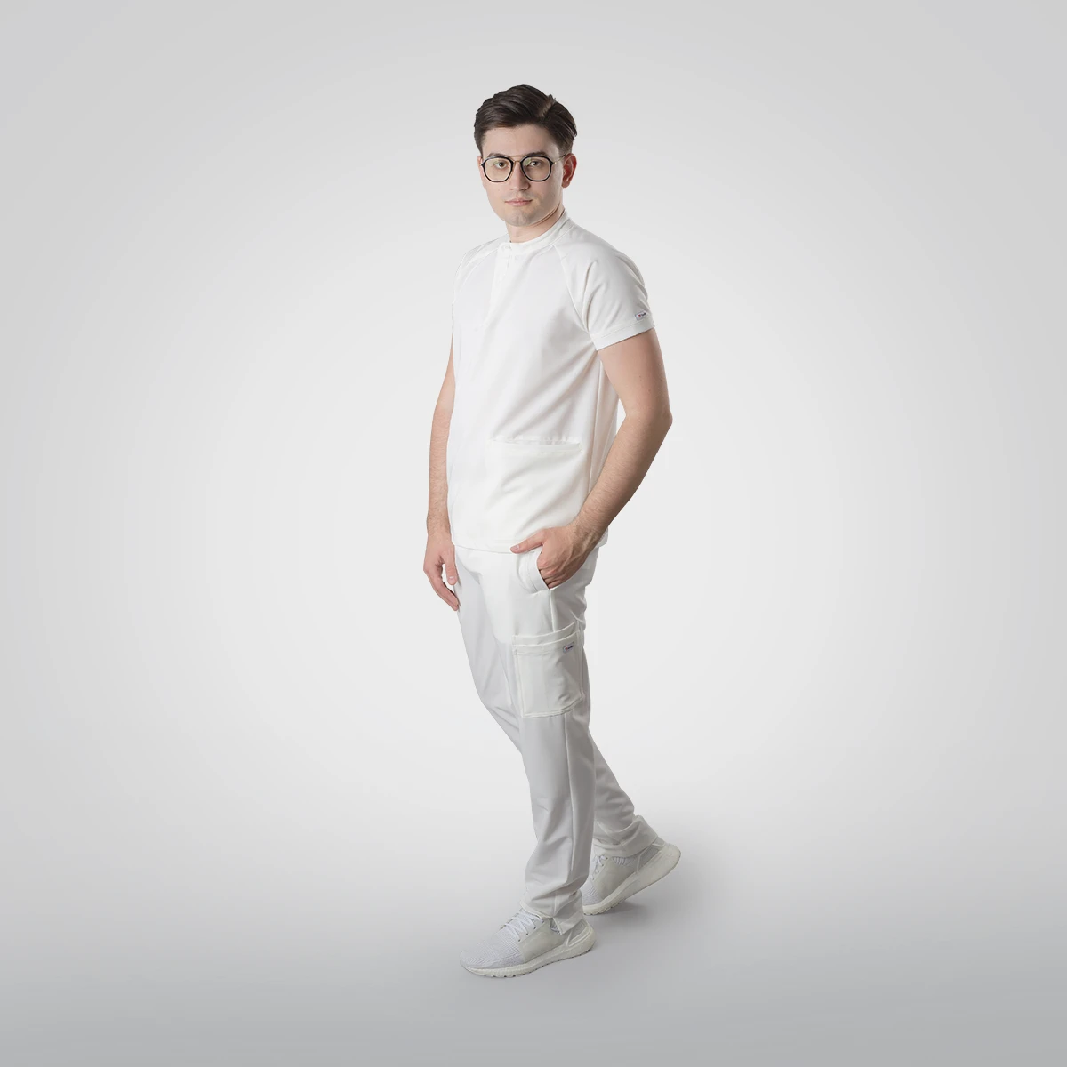 Costumul medical alb de bărbați Harvey include bluză medicală cu mânecă scurtă și doi nasturi ascunși și pantaloni medicali cu un buzunar dublu multifuncțional