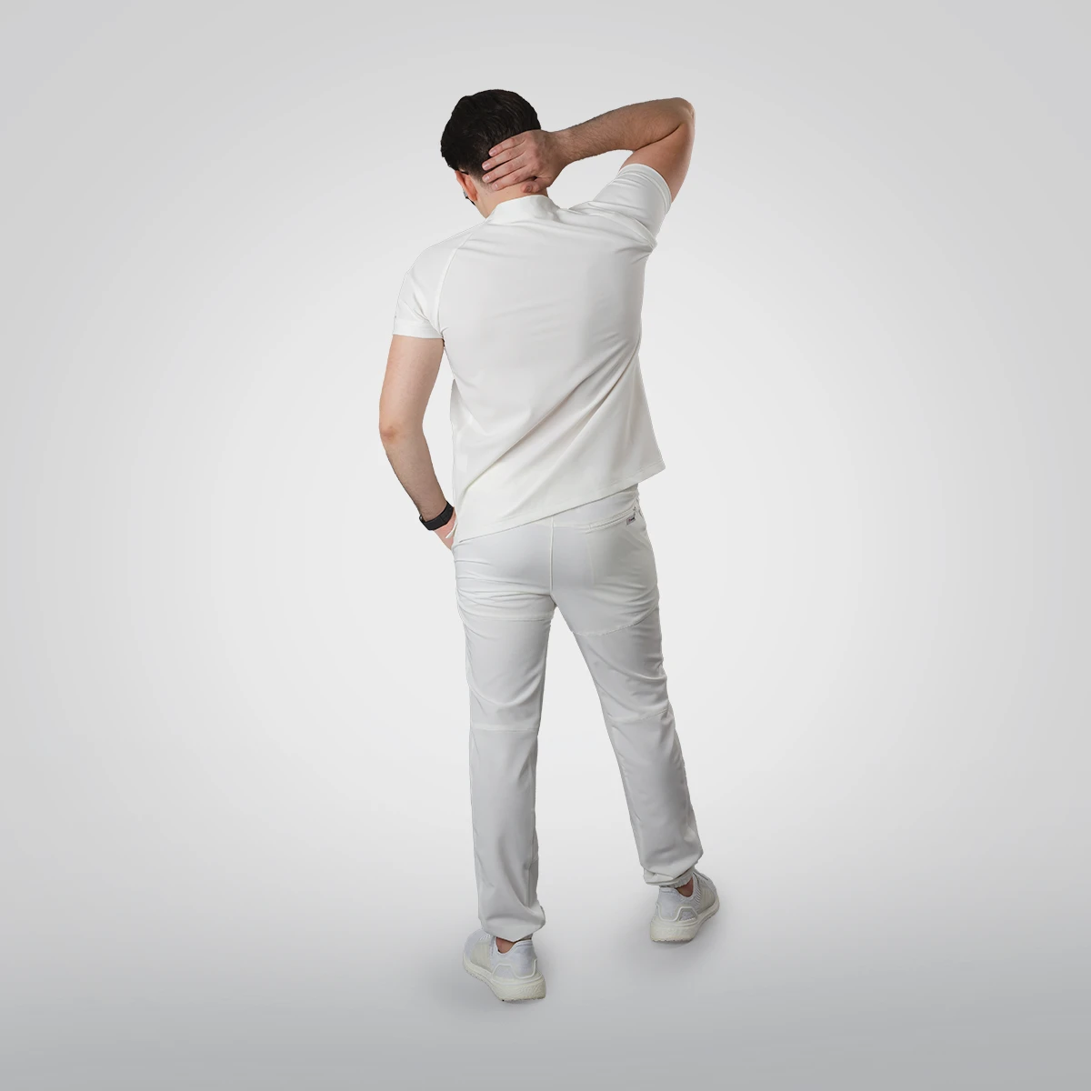 Costumul medical alb Hunter de bărbați compus din bluză și pantaloni reprezintă mixul perfect dintre funcționalitate și calitate.