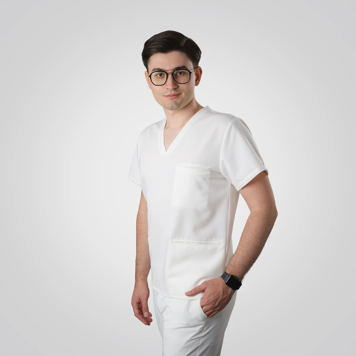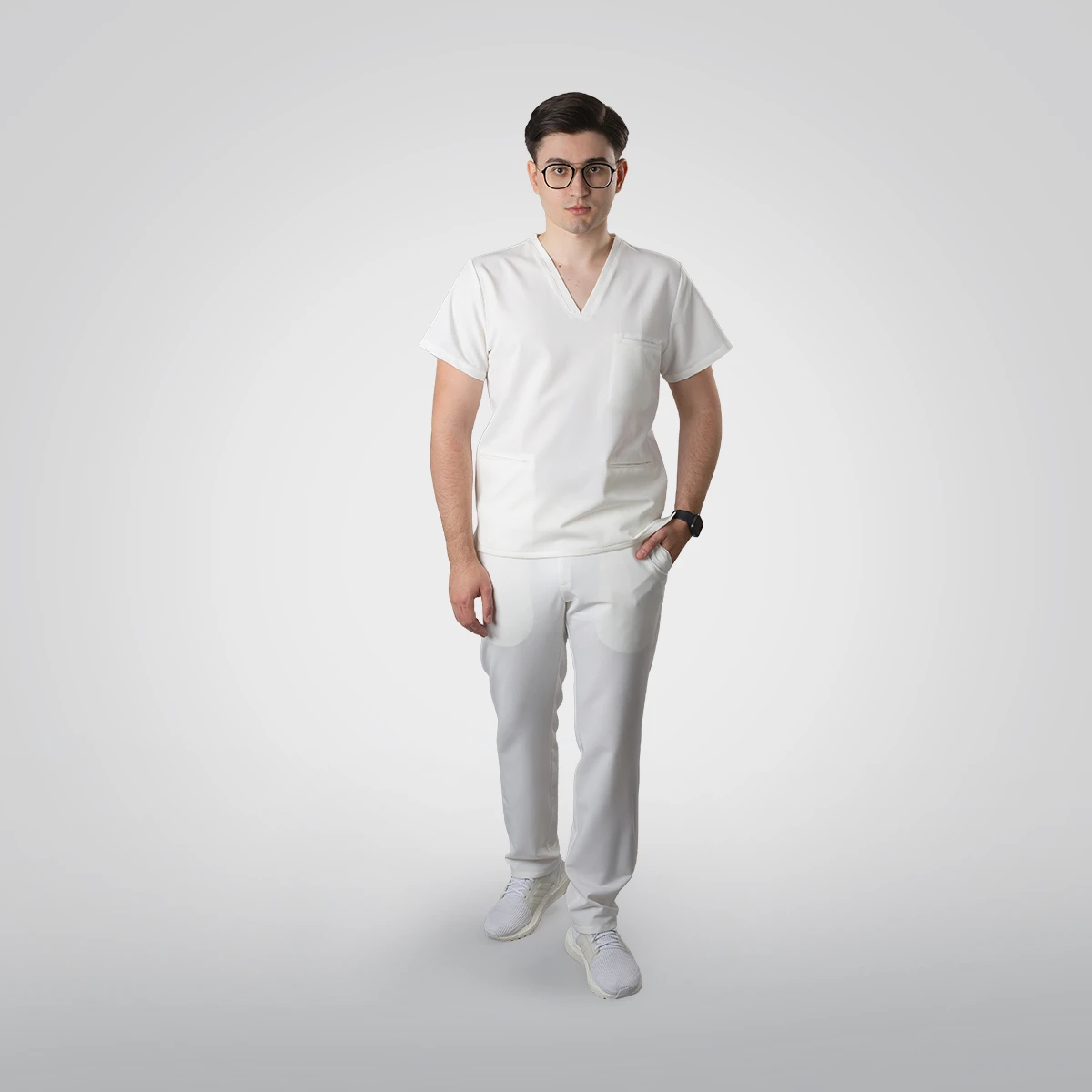 Costumul medical alb Osler de bărbați compus din bluză și pantaloni reprezintă mixul perfect dintre funcționalitate și calitate.