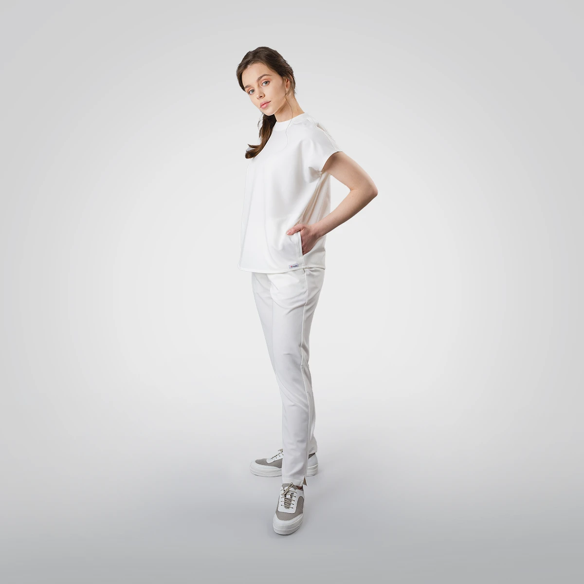 - Costumul este conceput cu o bluză medicală cu mânecă scurtă și croială lejeră, cu închidere la spate, la baza gâtului, cu umeri căzuți, cu două buzunare laterale și unul ascuns pentru depozitare, și cu pantaloni medicali cu elastic în talie, croială ușor conică, fente scurte la tiv și două buzunare laterale.