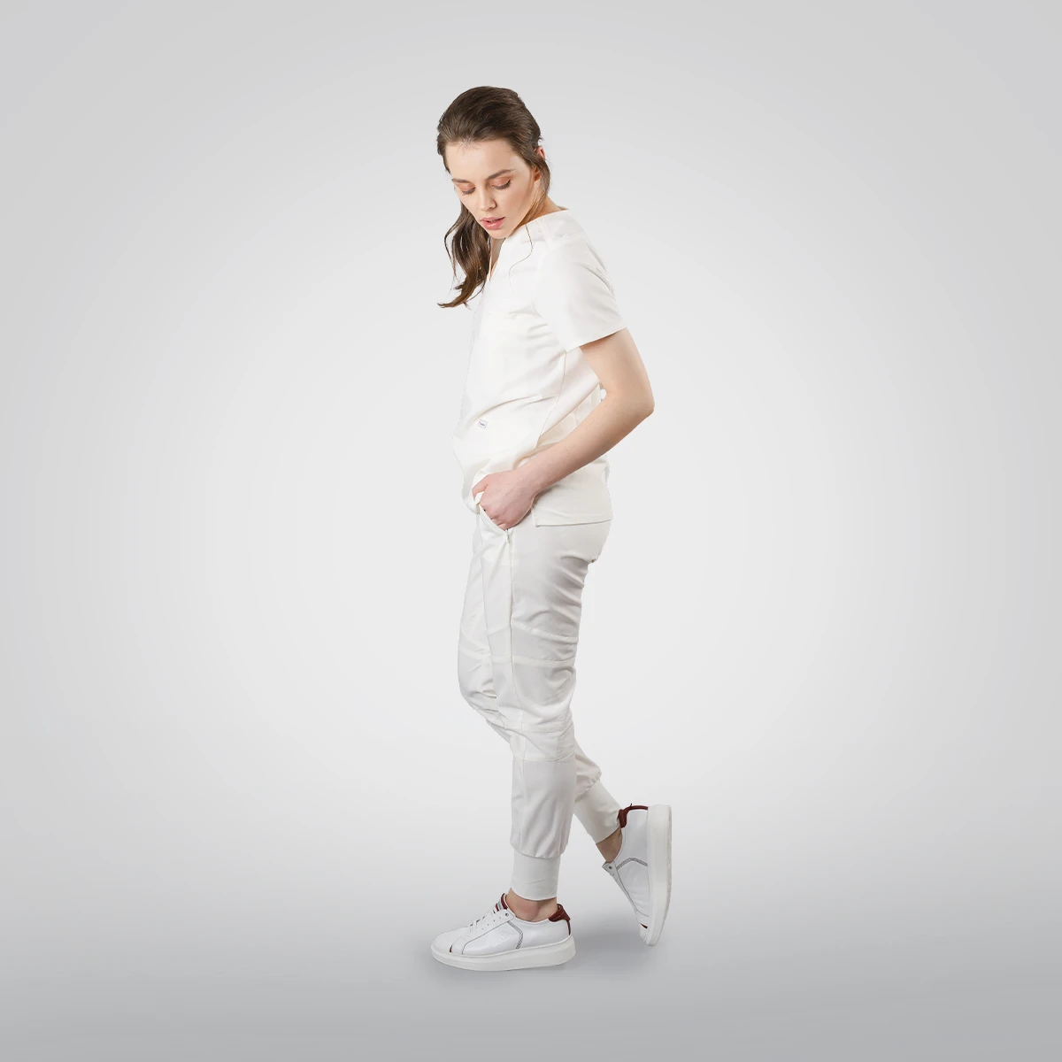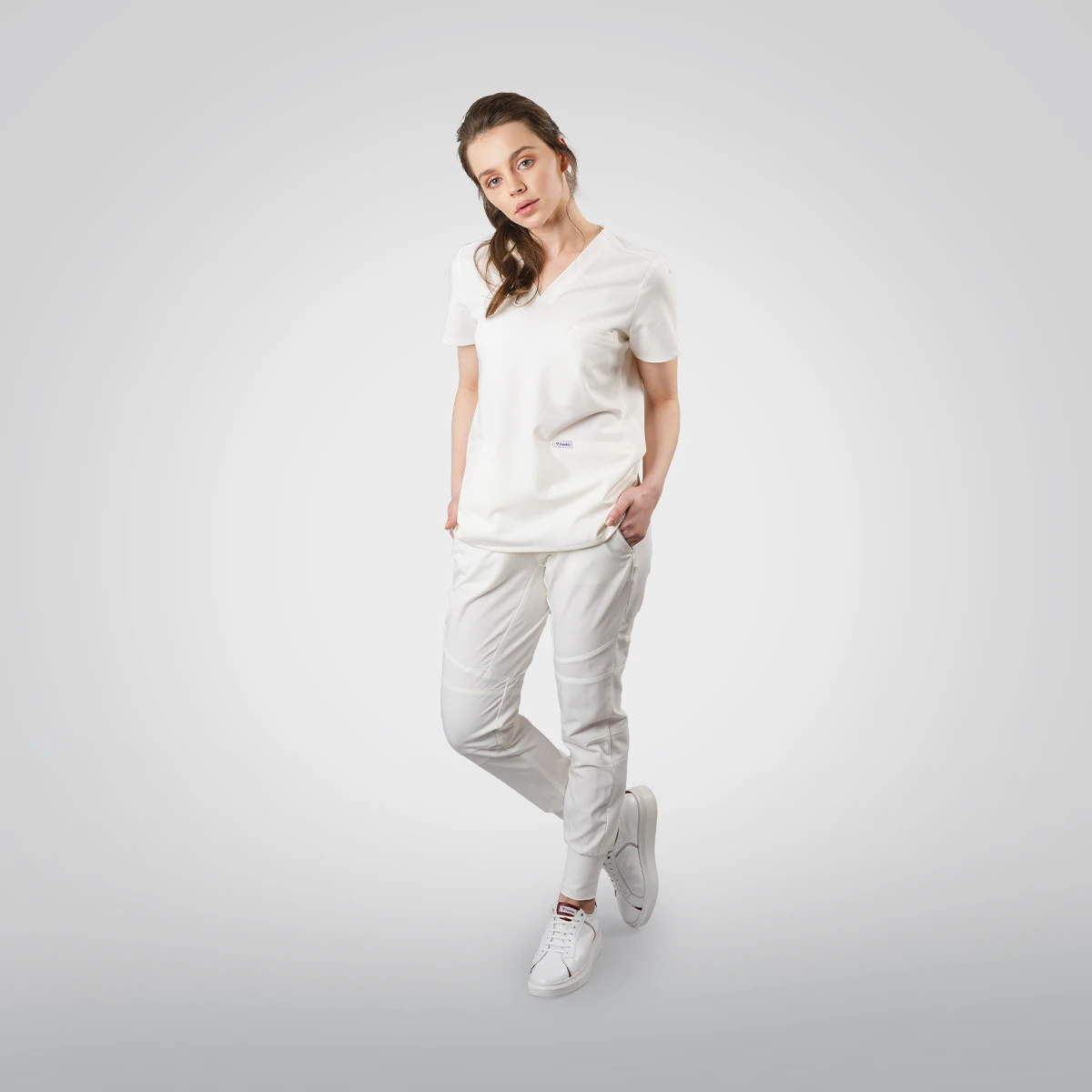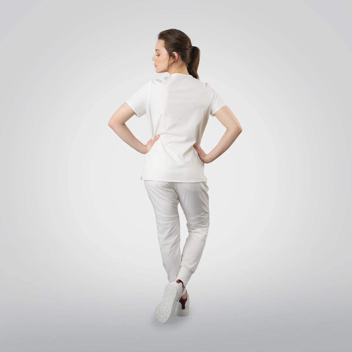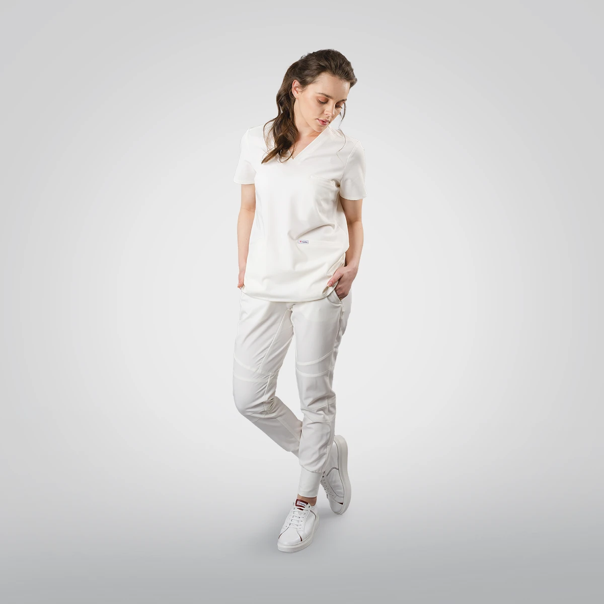Costumul medical alb de damă Okami include bluză medicală modernă, cambrată și pantaloni medicali cu o croială lejeră și conică