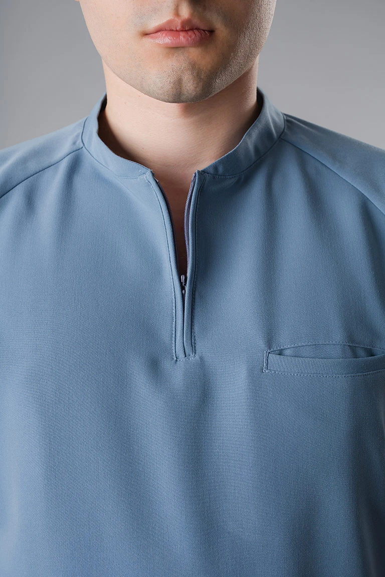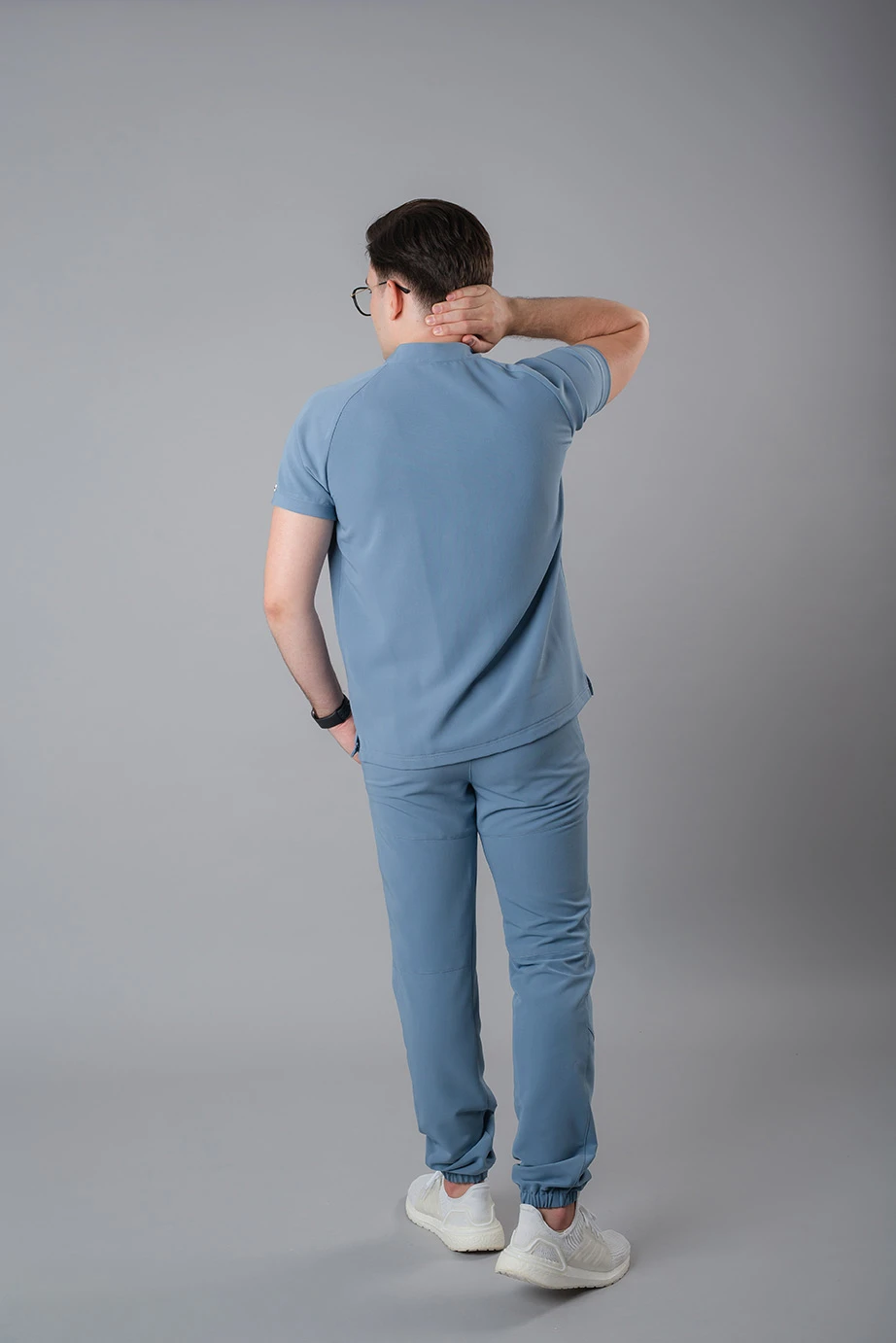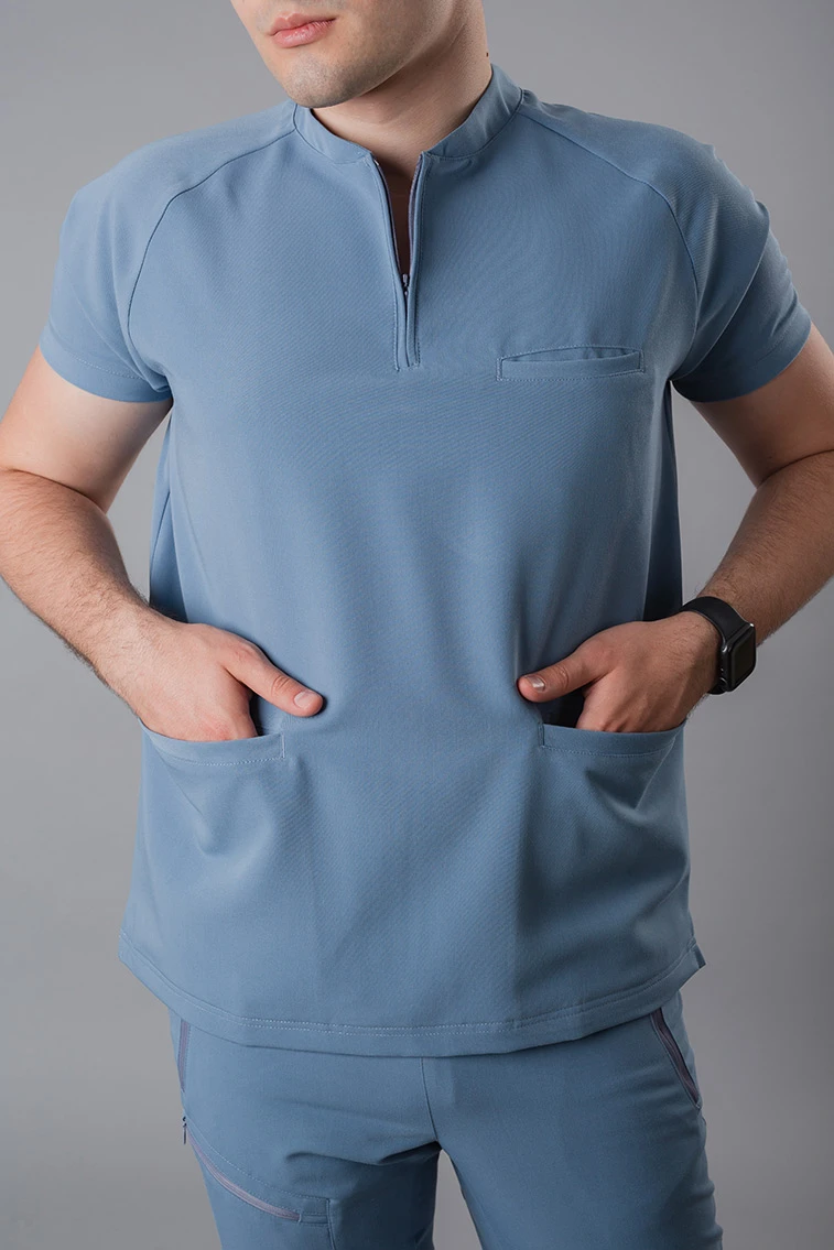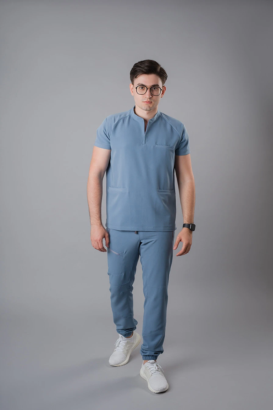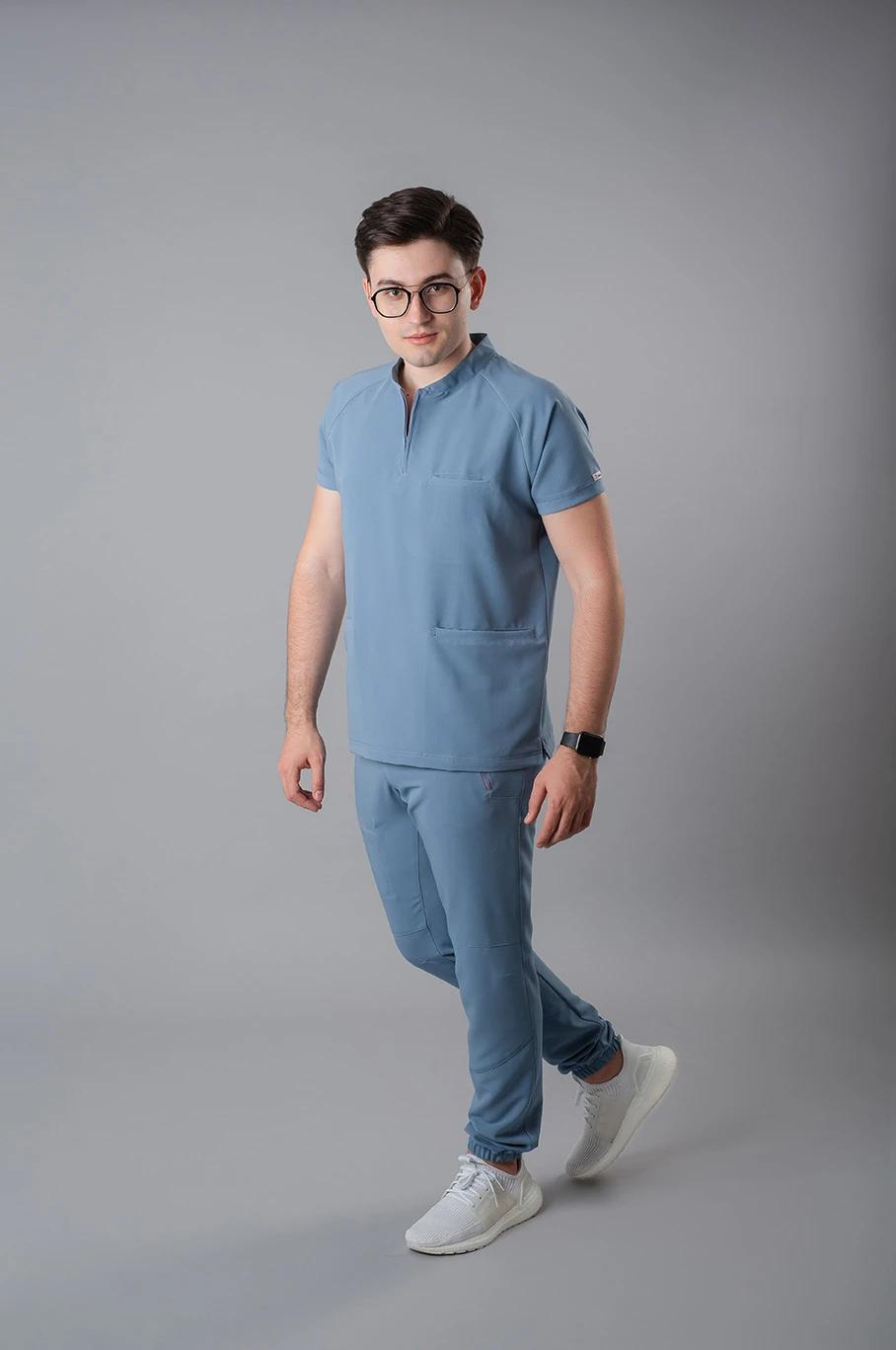 Costumul medical bleu de bărbați Hunter include bluză medicală croită cu deschidere cu fermoar și pantaloni medicali cu elastic și cusături decorative