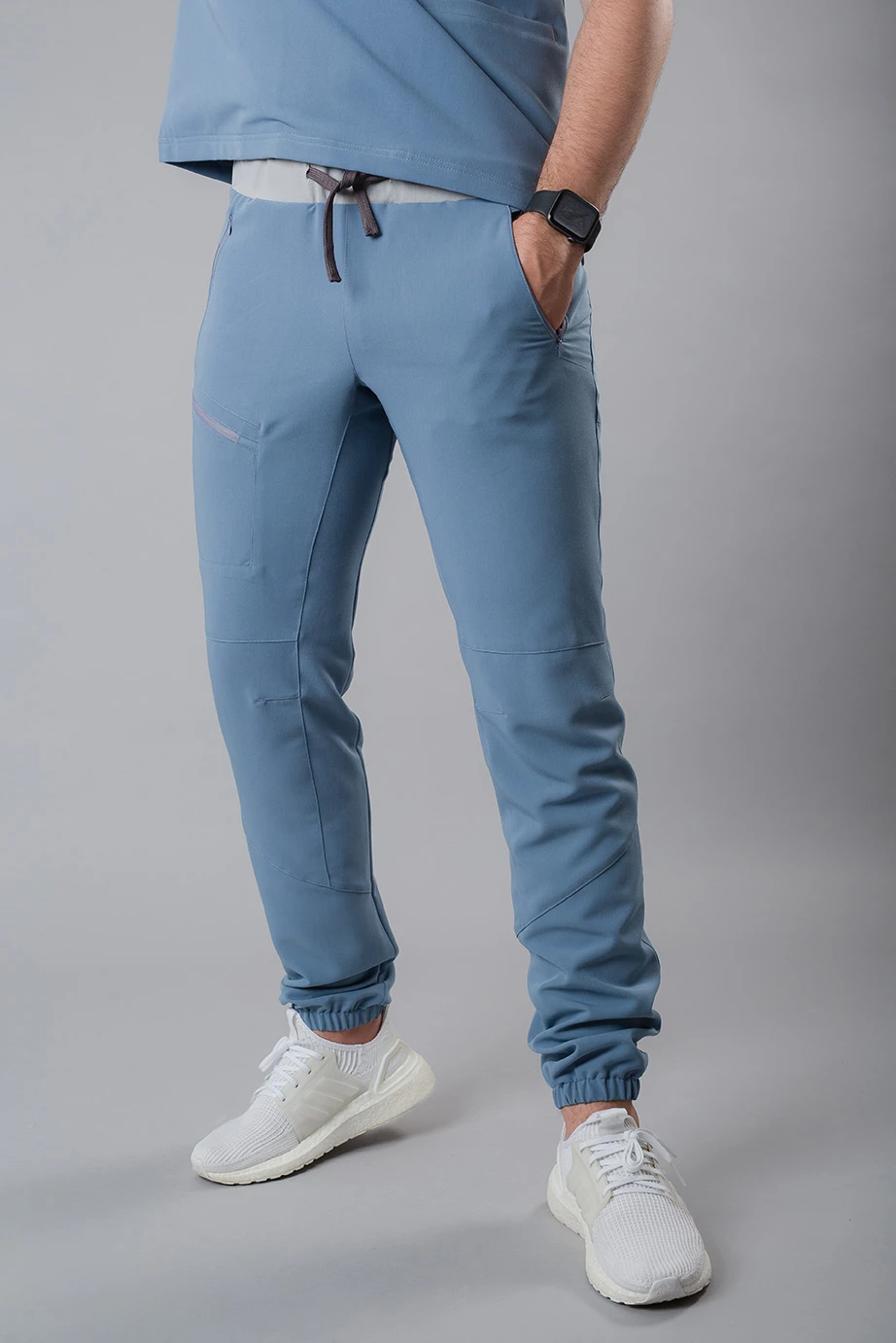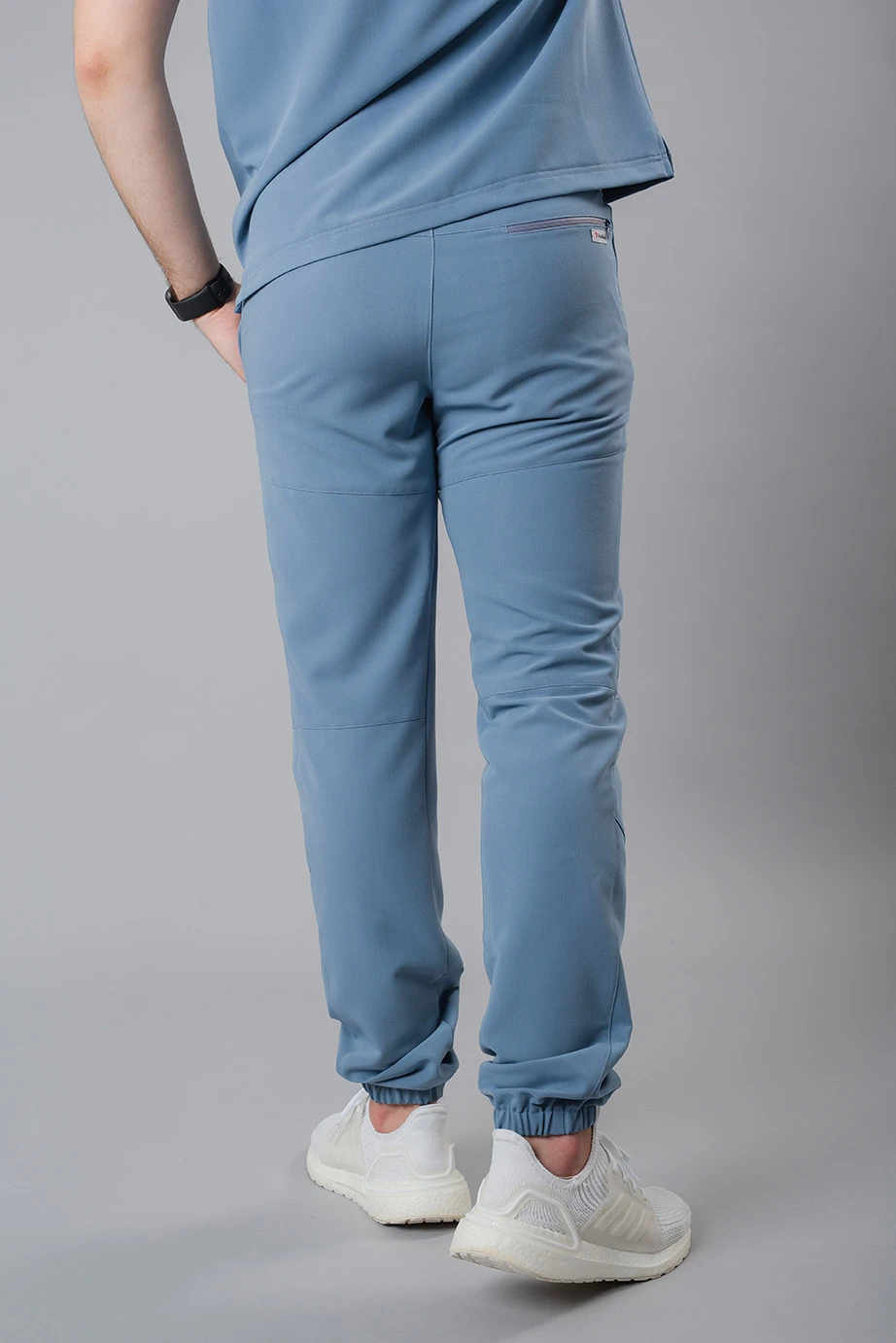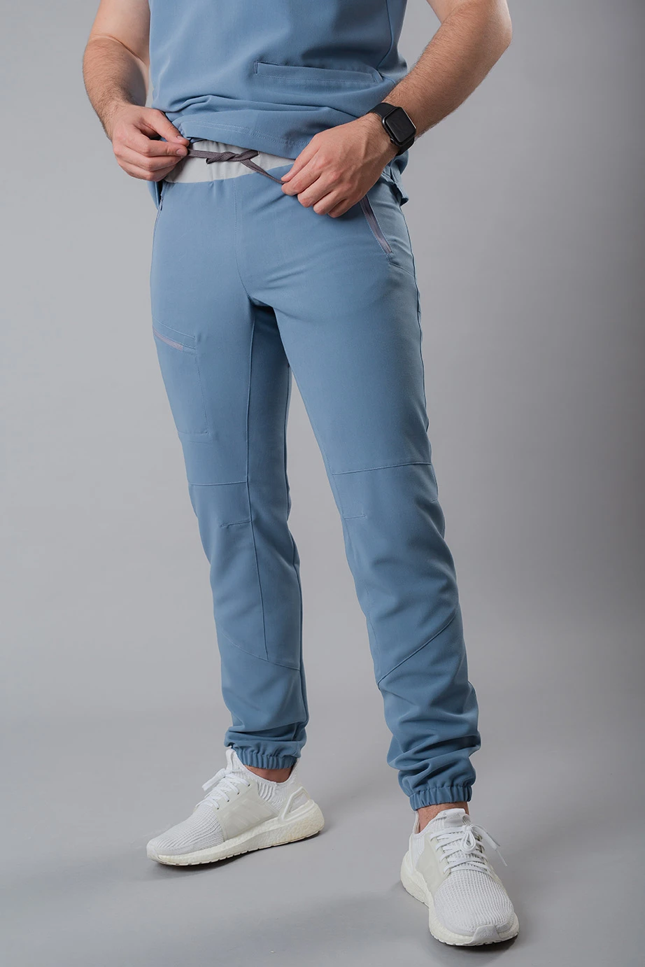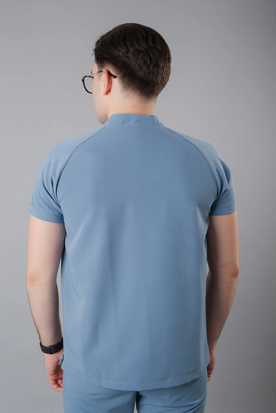 Costumul medical bleu de bărbați Hunter include bluză medicală croită cu deschidere cu fermoar și pantaloni medicali cu elastic și cusături decorative