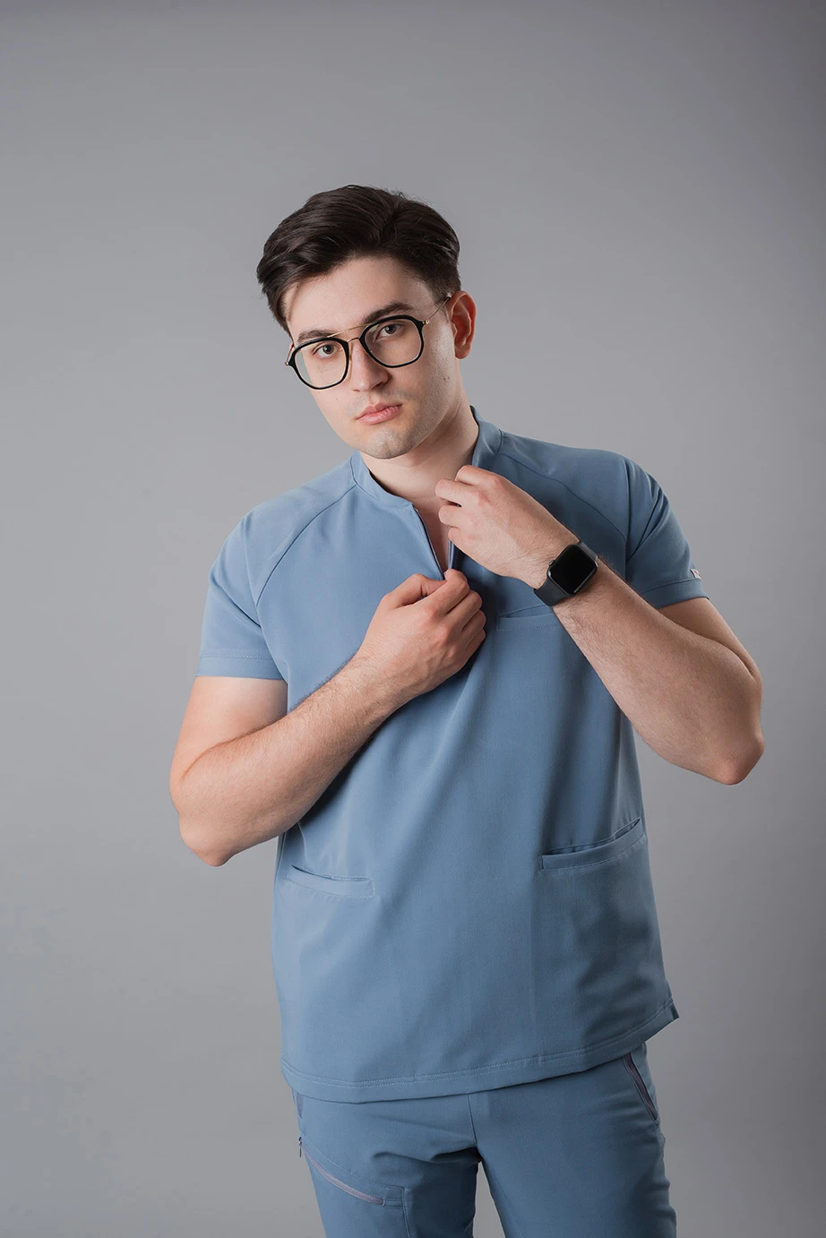 Costumul medical bleu Hunter de bărbați compus din bluză și pantaloni reprezintă mixul perfect dintre funcționalitate și calitate.