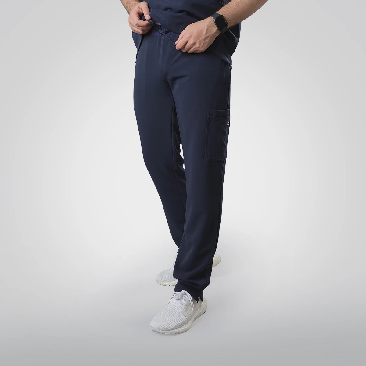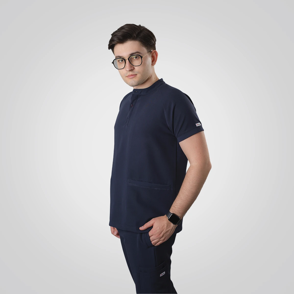 Costumul medical bleumarin de bărbați Harvey include bluză medicală cu mânecă scurtă și doi nasturi ascunși și pantaloni medicali cu un buzunar dublu multifuncțional