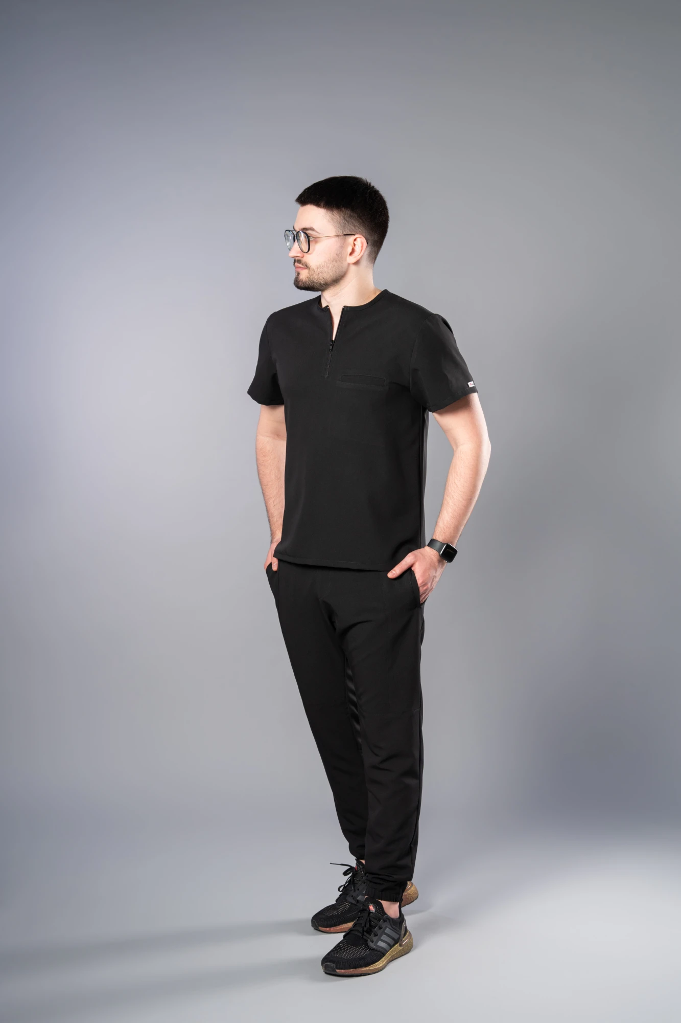 Costumul medical negru de bărbați Obi include bluză medicală croită lejer, cu deschidere cu fermoar și pantaloni medicali flexibili și confortabili