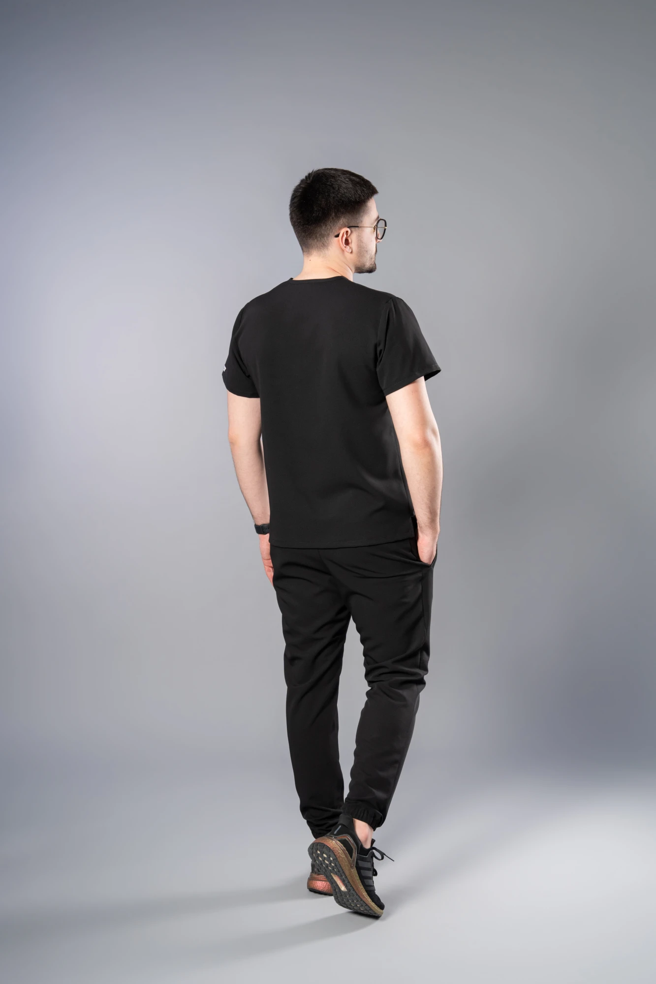 Costumul medical negru Obi de bărbați compus din bluză și pantaloni reprezintă mixul perfect dintre funcționalitate și calitate.