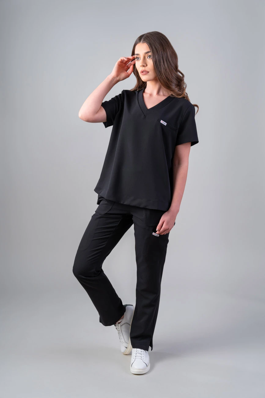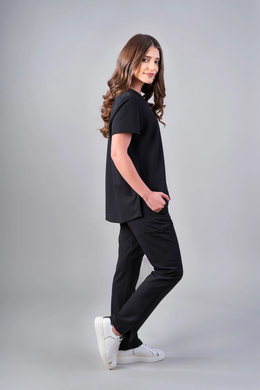 Costumul medical negru Cutzarida de damă compus din bluză și pantaloni reprezintă mixul perfect dintre funcționalitate și calitate.