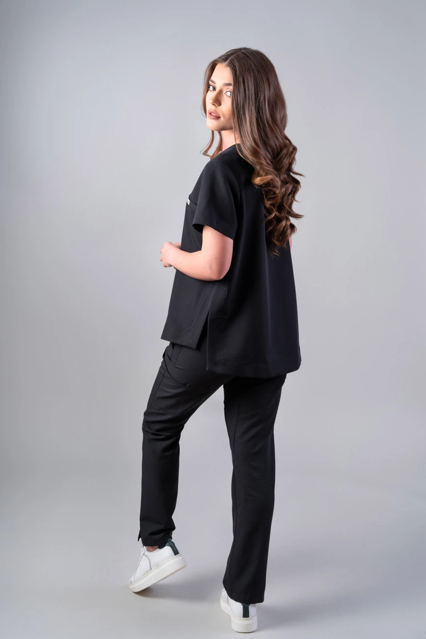 Costumul medical negru de damă Cutzarida include bluză medicală cu o croială ușor evazată și elegantă și pantaloni medicali multifuncționali și practici