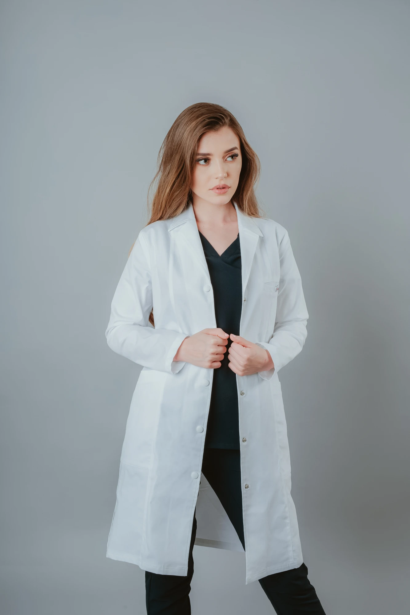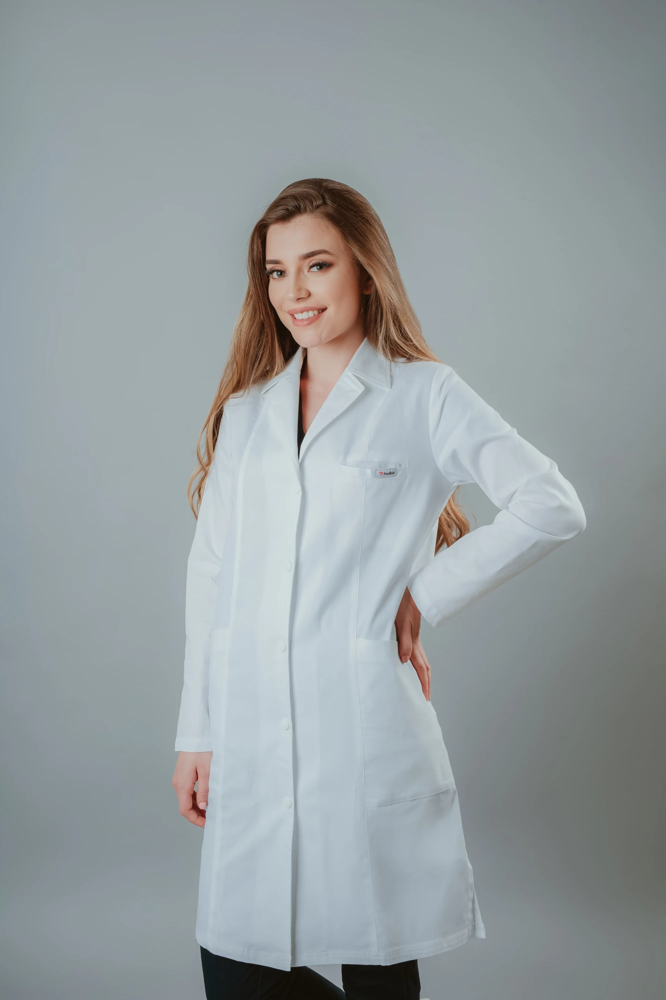 Halat de laborator alb de damă Sabin cu mânecă lungă, modern, elegant, croit lejer cu trei nasturi și două buzunare pentru depozitare